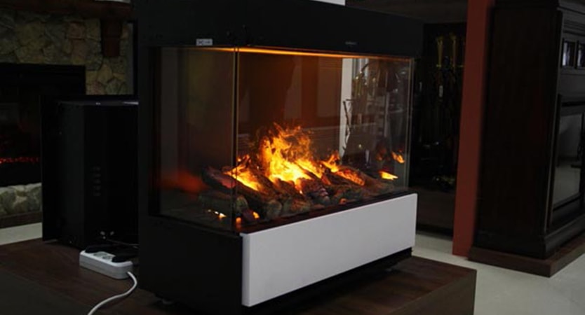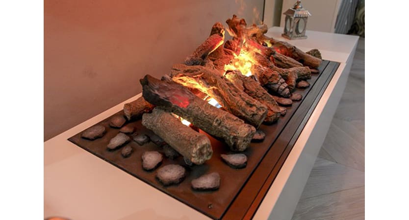 Au centre du foyer, il y a des trous qui laissent entrer la vapeur, ce qui simule le feu. Le rétroéclairage produit l'effet souhaité.