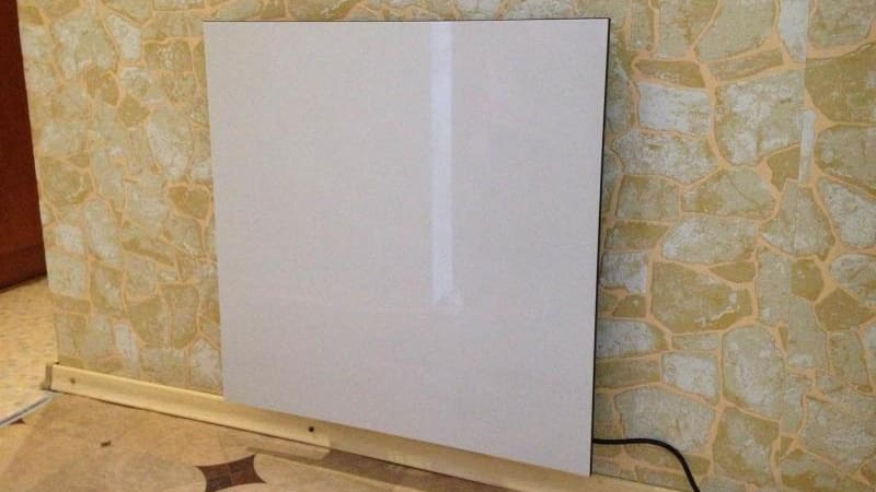Un tel dispositif peut être utilisé comme radiateur au sol ou monté sur un mur. L'élément chauffant de cet appareil est une plaque métallique avec un revêtement minéral en couches transparent.