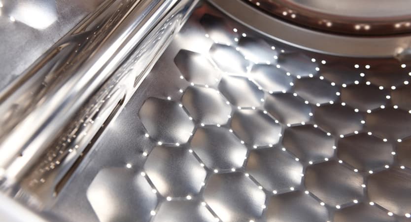 Les trous dans les tambours en nid d'abeilles sont si petits qu'il est impossible d'y resserrer le tissu. De plus, la combinaison des parties convexes et concaves du tambour crée un mince film d'eau sur la surface, qui empêche les fibres de tissu de frotter contre le métal du réservoir de chargement.