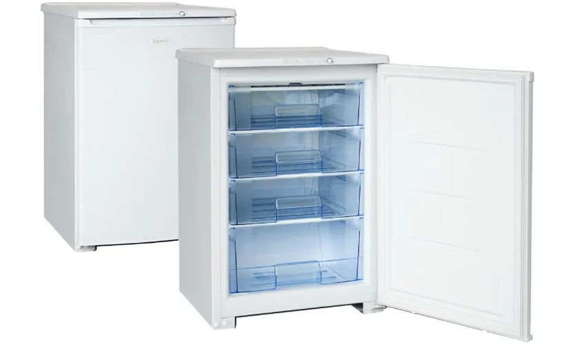 Congélateur d'une taille de 58x62x85 cm avec un volume de 110 litres. Matériau du boîtier plastique / métal. Contrôle électromécanique. Propulsé par l'isobutane (R600a), comme le reste des modèles de la revue (sauf le dernier). Il y a 4 boîtes en plastique dans la cellule. Il congèle des produits jusqu'à 12 kg par jour. Se garde au froid pendant 10 heures sans électricité. Classe climatique N. La température minimale dans la chambre est de -18 °. Consomme de l'électricité selon la classe A. Consommation 223 kWh. La porte peut être suspendue du côté opposé. Le dégivrage se fait manuellement. Poids 36 kg. Bruit jusqu'à 42 dB. Prix: 10530 roubles.