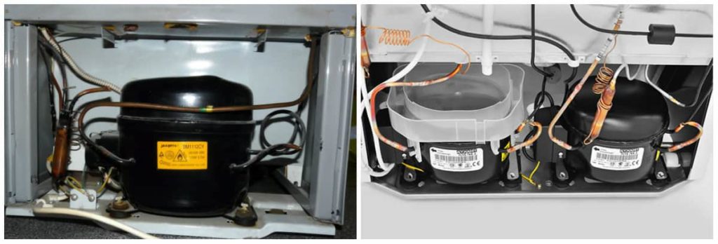 Extérieurement, il est presque impossible de distinguer un réfrigérateur mono-compresseur des nouveaux modèles équipés de deux moteurs-compresseurs. Pour ce faire, vous devez regarder le panneau arrière du réfrigérateur. En faisant cela, vous pouvez voir 2 unités de contrôle et 2 circuits de refroidissement séparés. Alors que les modèles traditionnels à compresseur unique fonctionnent à partir d'un circuit pour le réfrigérateur et le congélateur. Le réfrigérateur à deux compresseurs est alimenté par deux unités installées individuellement. En fait, ce sont deux appareils distincts, placés l'un sur l'autre. C'est la principale différence.