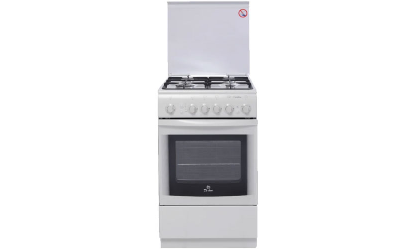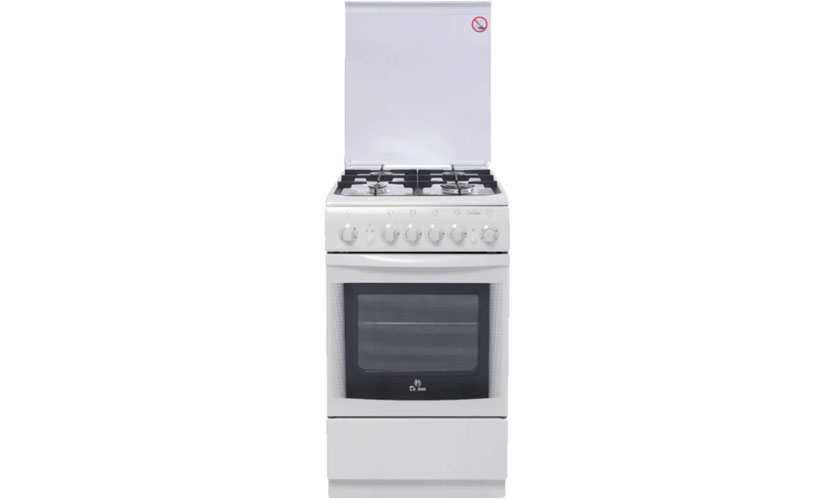 Poêle (50x60x85 cm) pour 4 brûleurs (un grand). Dispose d'un four rétro-éclairé d'une capacité de 54 litres. Il y a un gril et une broche inclus. Prévu pour l'arrêt du gaz en l'absence de feu dans le four. L'allumage électrique est destiné uniquement aux zones de cuisson. Il y a une minuterie.