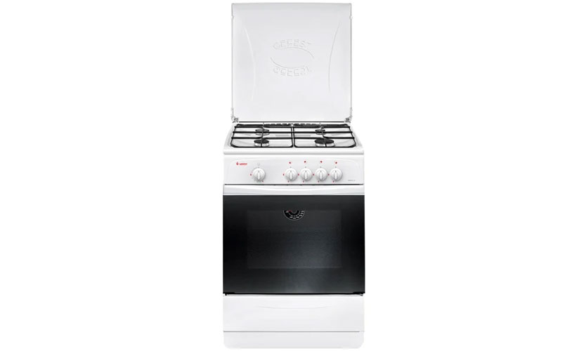 Dalle (60x60x85 cm) recouverte d'émail. Four d'une capacité de 63 litres. Porte battante avec deux verres. Conçu pour quatre brûleurs (un chauffage rapide). En bas, il y a un tiroir pour ranger la vaisselle. Réglable avec des poignées standard. Le four est éclairé, dispose d'une coupure de protection contre le gaz d'extinction du feu.