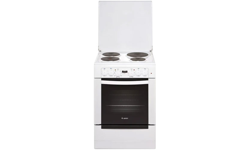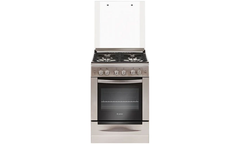 Modèle (60x60x85 cm) pour 4 brûleurs. La plaque de cuisson est recouverte d'émail. Four 52 litres avec grill. Je suis entré dans la revue en raison de la présence de la fonction de convection. Livré avec une broche. En bas, il y a un compartiment de rangement pour les casseroles. Il est contrôlé par des poignées ordinaires. Il y a une minuterie d'arrêt. Il y a un tableau informatif et une horloge sur le boîtier.