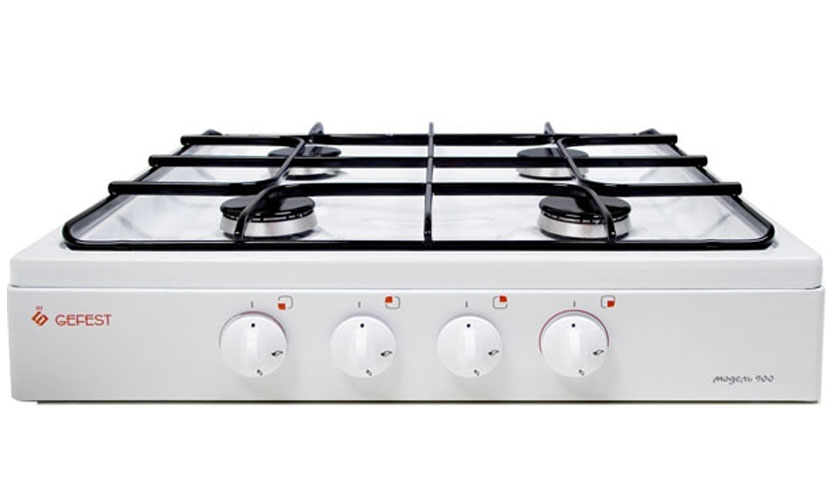 Table de cuisson à gaz blanche (50x52x15,7 cm) sans four avec revêtement en émail pour quatre brûleurs. A des jambes réglables. Contrôlé par des boutons rotatifs.