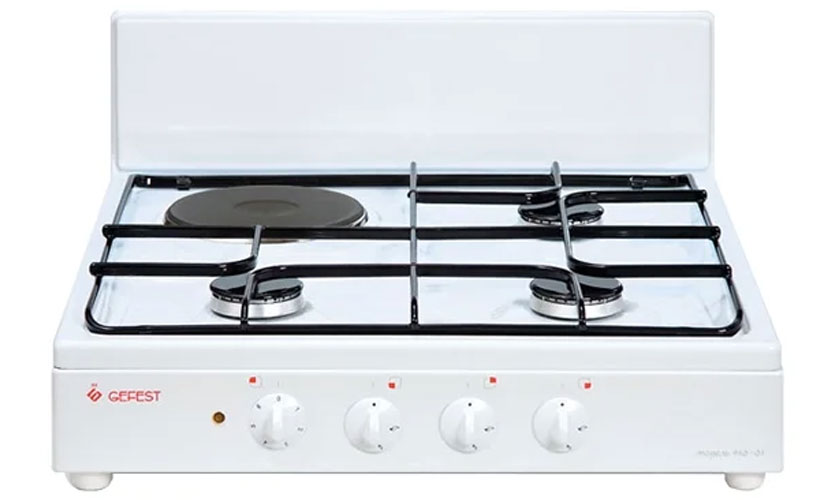 Modèle (50x52x12,7 cm), sur lequel il y a trois brûleurs à gaz et un électrique. N'a pas de four. A une finition en émail. Le réglage se fait avec des poignées.