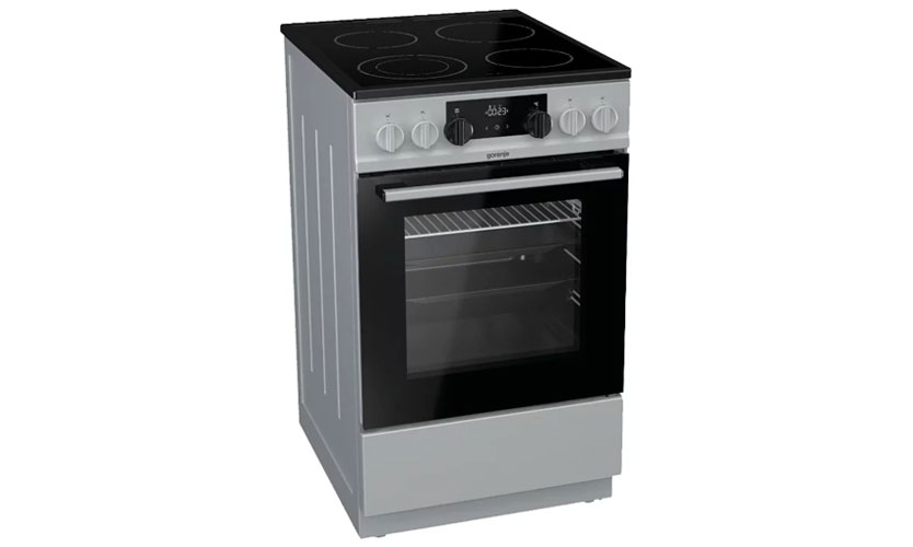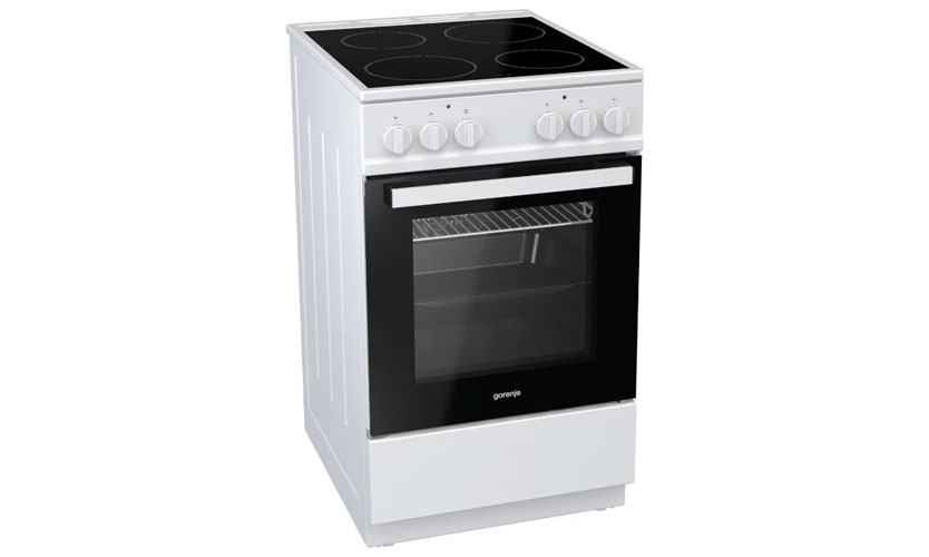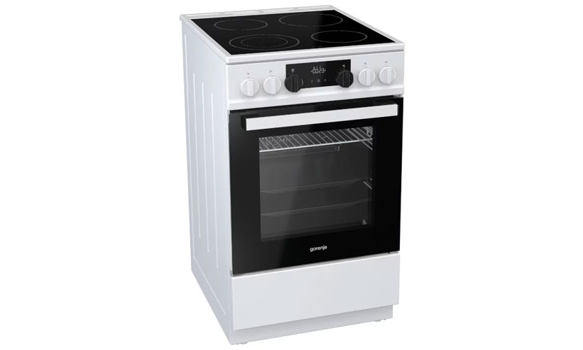 Modèle blanc (50x60x85 cm) avec revêtement en vitrocéramique. Il dispose de 4 brûleurs électriques (un double circuit).Four 70 l avec grill électrique et convection. La commutation se produit avec des poignées mécaniques. Il y a un indicateur de chaleur résiduelle. Sur le devant, il y a un écran et une horloge. Il y a une minuterie. Puissance 9,1 kW.