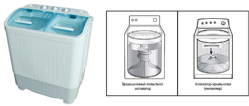 Les laveuses de type activateur sont un réservoir avec un moteur. Vous versez de l'eau chaude dans la machine et versez de la lessive ordinaire à l'intérieur, vous pouvez même la laver à la main. Démarrez la minuterie et attendez que le moteur essore votre linge. Ensuite, l'eau savonneuse est évacuée, vous remplissez d'eau propre et redémarrez le minuteur - pour le rinçage. Lorsque le lavage est terminé, vous pouvez tordre le linge à la main, utiliser un dispositif d'essorage spécial ou une centrifugeuse, si votre laveuse en a une.