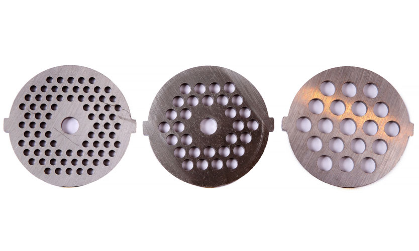 - Disques de viande hachée perforés - un petit cercle en acier inoxydable avec un grand nombre de trous, l'ensemble peut être livré avec différents diamètres de trous.