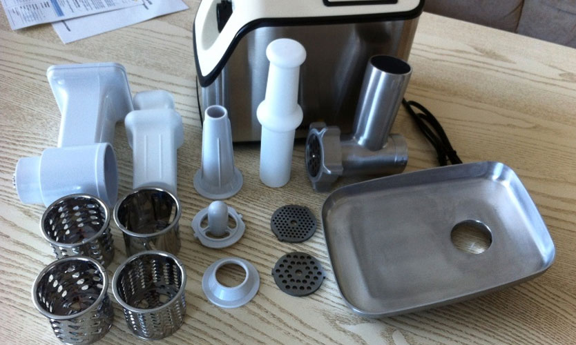 La principale différence avec un hachoir à viande conventionnel est la présence d'un moteur électrique, il fait tourner l'arbre à travers une boîte de vitesses et traite le produit. Un engrenage avec une vis est attaché à l'arbre, puis les couteaux, la structure se termine par un treillis. Un écrou de serrage est utilisé pour la fixation.
