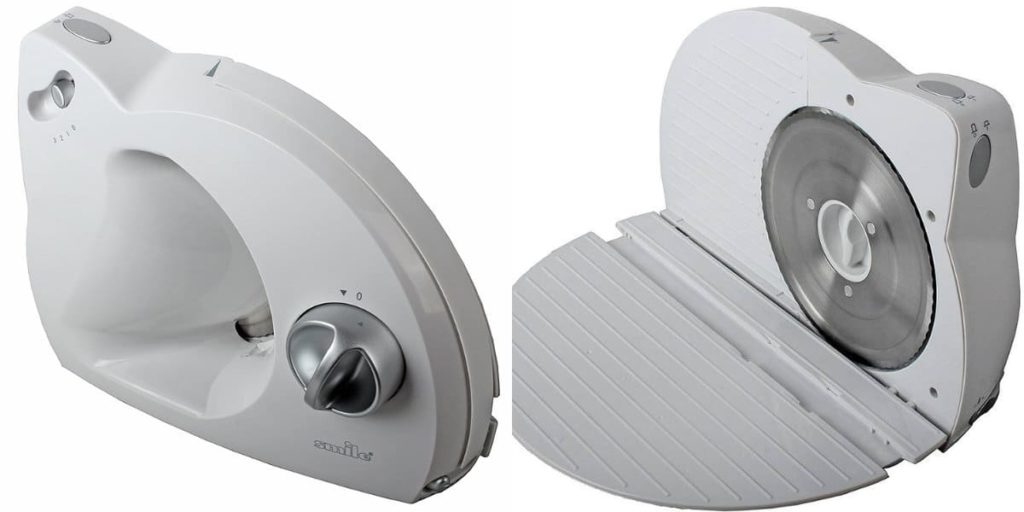 Modèle de haute qualité et assez économique d'un fabricant d'équipement fiable. Un appareil stable et compact, la puissance de fonctionnement est faible - seulement 100 W, cependant, cela suffit pour la découpe de bijoux de tous les produits avec différentes épaisseurs de tranches. Il y a un capuchon de protection, un bouton de verrouillage contre tout démarrage accidentel, une niche spéciale pour un couteau, un compartiment pour le câble. La trancheuse est facile à utiliser, très silencieuse et ne prend pas beaucoup de place sur la surface de coupe.