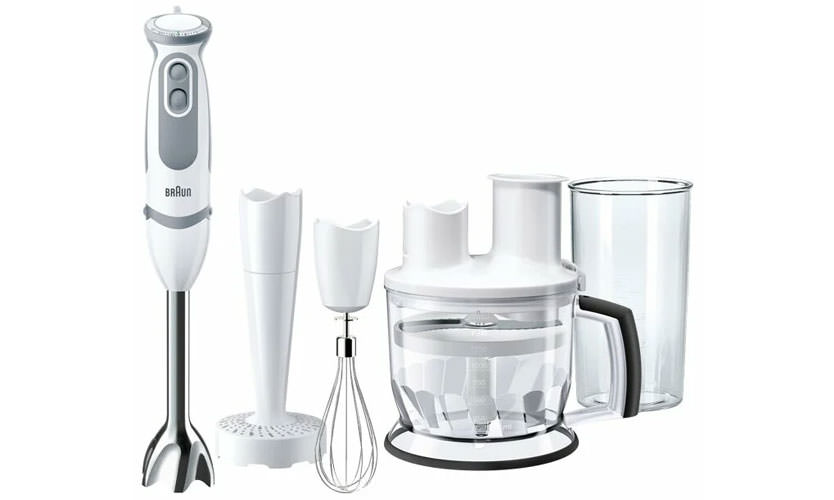 Mélangeur de fitness d'une puissance de 750 W, 21 modes de vitesse et mode d'impulsion "Turbo". Poignée ergonomique confortable, revêtement antidérapant. L'ensemble comprend la documentation, une partie d'immersion, l'appareil lui-même, des lames remplaçables, un fouet, une râpe, un disque à trancher, des buses pour purée de pommes de terre, des frites, la préparation de la pâte. Hachoir d'un volume de 1,5 litre. Verre à mesurer - 0,6 l. Le prix est de 6000 à 7000 roubles.