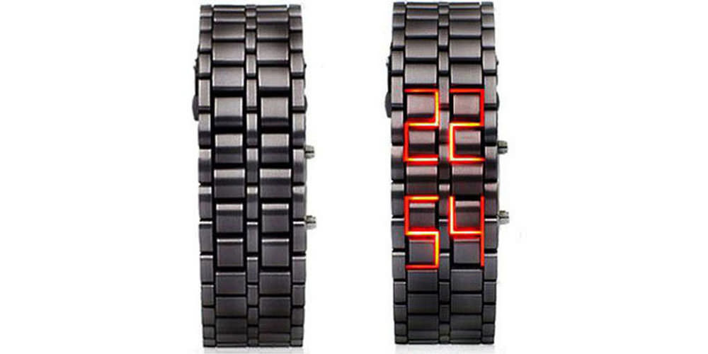 Montre noire futuriste à la mode avec indication de l'heure rouge. Facile à utiliser. Prix - 265 roubles.
