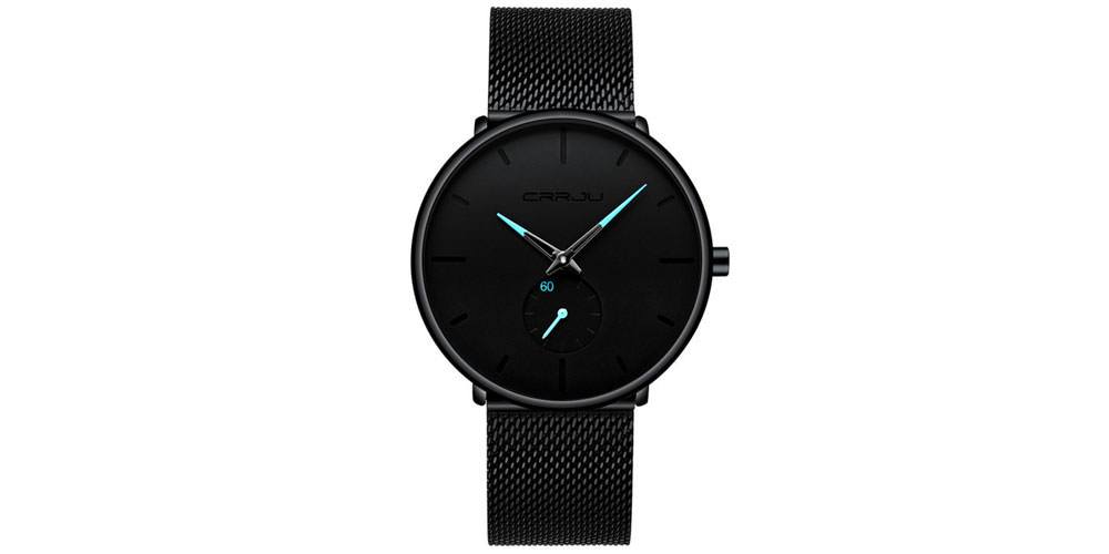 Montre ultra-mince à la mode originale avec cadran noir, étanche, antichoc. Prix - 775 roubles.