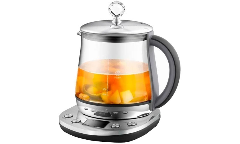 Une bouilloire d'un volume de 1,5 litre, en métal et en verre. Le couvercle est amovible. La température de chauffage est sélectionnée dans la plage de 40 à 100 °. Il remplit 6 fonctions: faire bouillir de l'eau, préparer du thé et de la soupe aux fruits, brasser des herbes médicinales, cuire de la viande. La mise sous tension est accompagnée d'une indication. Le niveau de remplissage est visible. Dispose d'un affichage, d'une minuterie. Se garde au chaud pendant 6 heures. Poids - 1,5 kg. Puissance - 1000 W. L'ensemble comprend une théière, un récipient en verre pour la cuisson ou le chauffage et une grille en métal pour le ragoût. Prix - 2630 roubles.