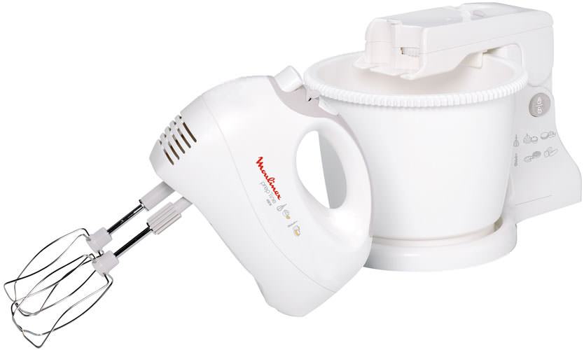 Mélangeur de cuisine domestique en blanc sur un support fixe. Le corps et le bol sont en plastique. Il dispose de 4 accessoires de travail - batteurs et pétrisseurs de pâte. Fournit 5 vitesses et mode turbo, l'interrupteur est situé sur la poignée du mélangeur. En plus, il y a un bouton pour supprimer les pièces jointes. Puissance - 450 W.