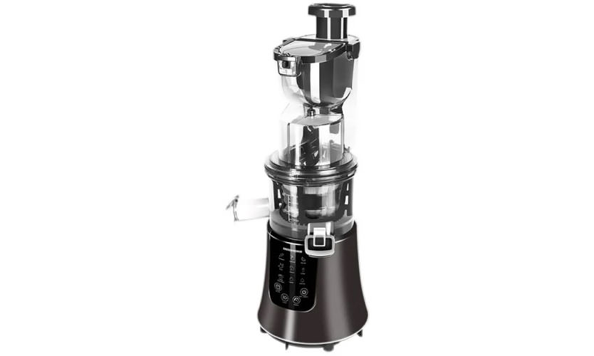 Fonctionne avec une alimentation directe de jus dans un verre. Le gâteau est automatiquement jeté. Contrairement au modèle précédent, le kit comprend un coupe-mousse. Ses performances sont supérieures - 100 tr / min. Le moteur démarre en douceur. La puissance est la plus basse des extracteurs à vis décrits dans la revue - 150 W. Il y a des pieds caoutchoutés sur le fond pour qu'il ne glisse pas sur la table. Couleur - noir, orange.