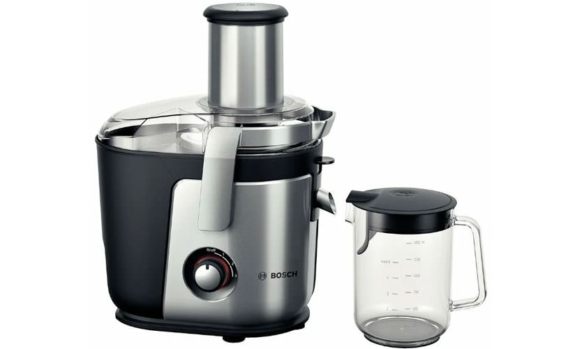 Une centrifugeuse polyvalente bon marché du géant de l'électroménager Bosch. Facile à utiliser, spacieux. Puissance - 1200 W, a 3 vitesses, peut traiter de grandes quantités de produits. Ceci est indiqué par les grands réservoirs de jus et de gâteau - 1,5 et 3 litres. Les conteneurs sont séparés et plus faciles à nettoyer. Matériau du corps - acier. Protection contre l'activation accidentelle, fonction d'éjection automatique de la pulpe, système "Drop-stop", séparateur de mousse, protection contre l'activation accidentelle.