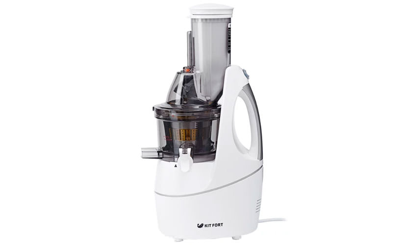 Kitfort KT-1104 est une alternative aux modèles coûteux avec une tarière verticale. Il utilise la technologie de la pression à froid à basse vitesse pour extraire le jus de tout type de fruits, légumes, herbes, tout en conservant le goût, l'arôme et toutes les vitamines avec des oligo-éléments. Le corps est en acier de haute qualité. Puissance - 240 W, capable de maintenir un fonctionnement continu pendant 30 minutes. Le volume du réservoir à jus est de 1 litre, ainsi que celui du réservoir à gâteau. Le nombre maximum de tours par minute 70. Fonctions d'éjection automatique de la pulpe, système "drop-stop", protection contre la surchauffe et l'activation accidentelle.