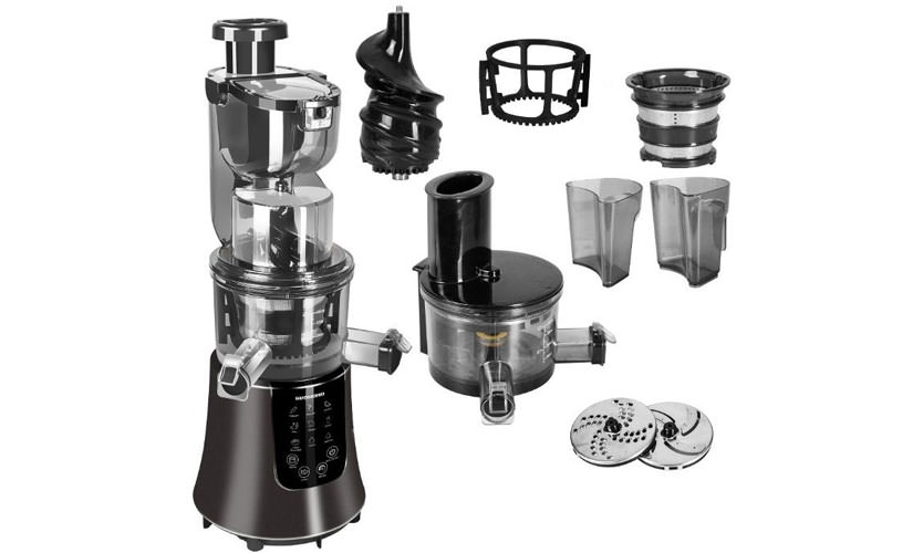 Un presse-agrumes avec une conception robuste, une large ouverture de chargement, une commande tactile confortable. La fonctionnalité du modèle est un ensemble de programmes pour la fabrication de jus de fruits et légumes mous et durs. Vous pouvez faire des shakes multivitaminés, du lait de noix et même presser des herbes fraîches. Le corps est en plastique, la puissance est de 200 W. Le volume des réservoirs pour le jus et le gâteau est de 1 litre. Il existe des fonctions de nettoyage inversé et automatique, vous pouvez acheter des accessoires supplémentaires et hacher, frotter la nourriture. En savoir plus dans la revue Mirandi J-100.