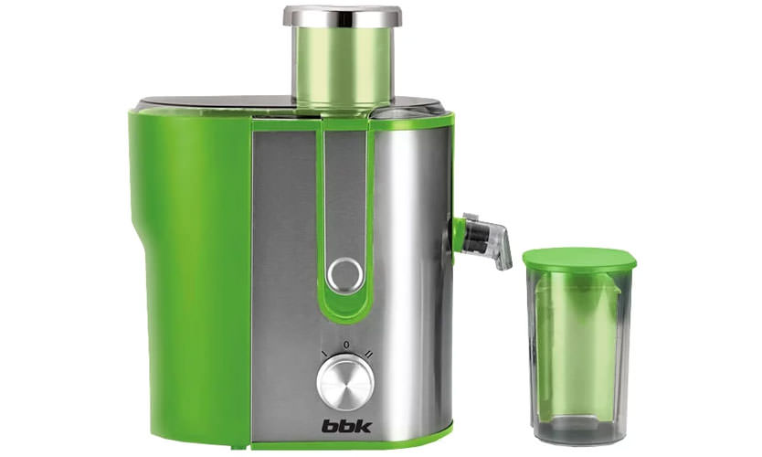 Prix - 6000 roubles. Couleur du boîtier au choix - vert ou jaune. Horizontal. Il n'y a qu'une seule tarière. Puissance de travail - 150 watts. Le jus coule dans un verre spécial. Le gâteau est collecté automatiquement dans un récipient. Un séparateur est prévu pour éliminer la mousse. Le moteur démarre en douceur.