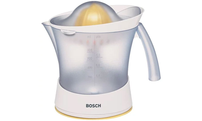 Boîtier en plastique, maille en acier inoxydable. Col rond, 55 mm. Indication de la quantité de jus. Éléments de support avec capuchons en caoutchouc. Il y a un compartiment pour le fil, sa longueur est de 80 cm Il y a une fonction de pré-nettoyage. La vitesse de travail n'en est qu'une.