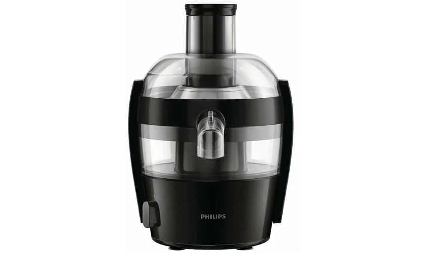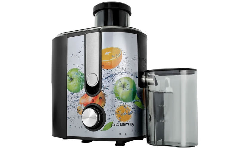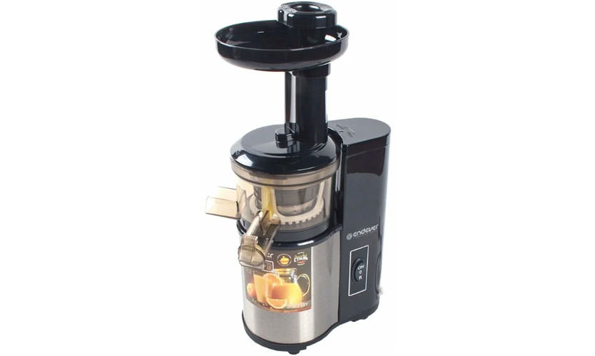 Prix - 4700 roubles. Couleur du corps - gris ou noir. Verticale. Une tarière. Puissance de travail - 350 watts. L'ensemble comprend un verre à jus de 1 litre. Le jus est fourni par flux direct, il existe un système contre les gouttes. La pulpe est déchargée dans un réservoir de 800 ml.