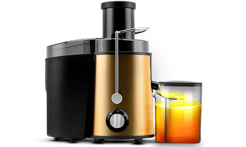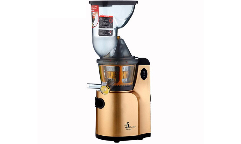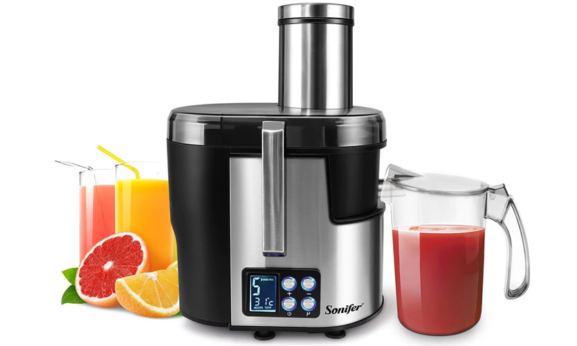 Presse-agrumes noir (30x28x18 cm). Corps en acier inoxydable. Les produits sont chargés à travers le trou rond supérieur de 8,5 cm de diamètre et 14 cm de hauteur, avec un couvercle à serrage manuel. Un filtre à mailles (acier inoxydable) avec cinq types de broyage élimine le jus. La vitesse est réglée manuellement avec les boutons correspondants. Equipé d'un écran affichant la température ambiante et le mode sélectionné: fruits rouges, agrumes, 2 types de pommes et aliments durs. Un bec avec un système anti-goutte (après l'avoir soulevé, le jus cesse de couler dans le verre). Conteneur à déchets en plastique 2 litres, pour jus - une cruche d'un volume de 1,5 litre. Productivité 12001-15000 tr / min. Cordon 1,2 m. Puissance 501 - 800 W. Poids 3,7 kg. Prix: à partir de 6130 roubles.