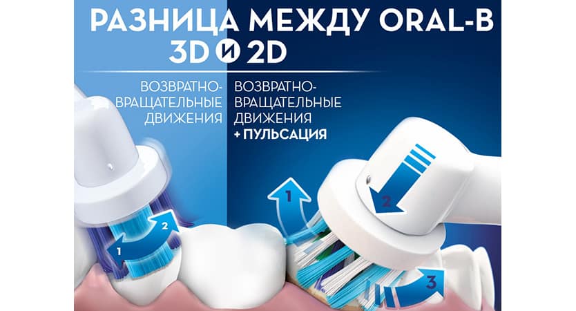 - La technologie de brossage 3D unique d'Oral-B, dont l'essence est que les poils et la brosse elle-même font un mouvement de va-et-vient en combinaison avec une pulsation.Cette solution vous permet de desserrer la plaque dentaire sur les dents et de l'enlever, ainsi que de fournir un massage doux des gencives.