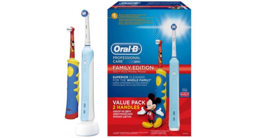 Dans l'ensemble familial de brosses à dents électriques Oral-B Family Edition, il existe deux positions complètes: Oral-B Professional Care 500 et Oral-B KIDS Mickey Mouse.