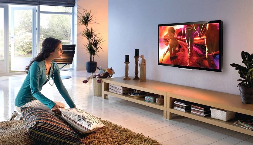 - pour les surfaces globales, les grands panneaux sont le plus souvent choisis: cela est requis par la surface et les proportions dans la conception des pièces, car la distance de vision augmente. Mieux vaut choisir un téléviseur Ultra HD. La meilleure qualité d'image garantira une visualisation agréable même sur le plus grand écran de télévision.
