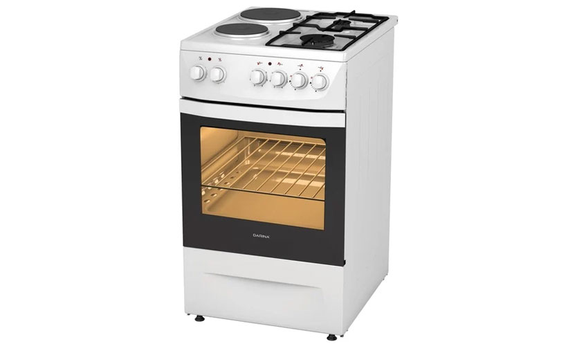 Modèle de dimensions 50x60x85 cm Four de 50 litres avec éclairage. Plaque de cuisson combinée en émail. Présenté par deux brûleurs électriques et deux brûleurs à gaz avec verrouillage de fuite de gaz. Allumage électrique automatique. Des boutons rotatifs sont fournis pour la mise en marche. Prix: 11590 roubles.