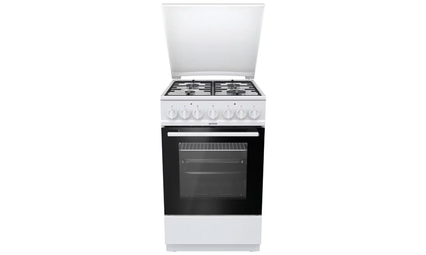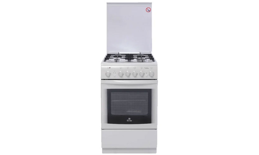 Le poêle en blanc, comme la plupart des modèles de test, mesure 50x60x85 cm. Four pour 54 litres avec grill (équipé d'une broche). Il y a un contre-jour. Le plan de travail émaillé est équipé de quatre brûleurs à gaz, dont l'un est conçu pour un chauffage rapide. Allumage électrique. Les boutons rotatifs sont utilisés pour changer. Les brûleurs sont protégés contre un fonctionnement sans feu. Équipé d'une minuterie avec un signal sonore. Prix: 11370 roubles.