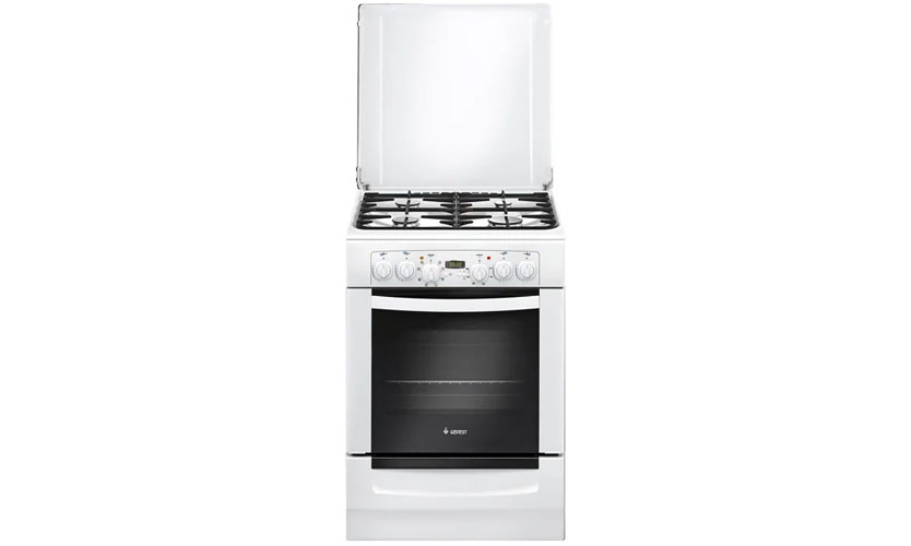 Tuiles 60x60x85 cm.Four 52 litres avec grill (broche incluse). Le rétroéclairage est fourni. Finition émaillée. Equipé de quatre brûleurs à gaz, un chauffage rapide. Ils sont allumés automatiquement par allumage électrique. Commande par interrupteur rotatif. Il y a un contrôle de gaz. Il y a une horloge sur le panneau.Vous pouvez régler le temps de cuisson à l'aide d'une minuterie. Prix: 19585 roubles.