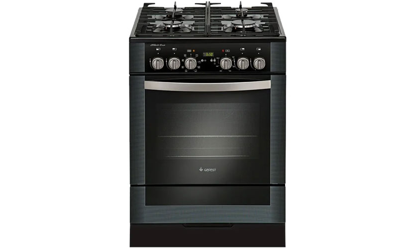 Version noire de dimensions 60x60x85 cm.Four de 56 L avec convection et grill (broche incluse). L'éclairage est disponible. Le panneau est en émail. Il y a quatre brûleurs à gaz (un chauffage rapide). Type mécanique d'allumage électrique. Actionné par des commutateurs rotatifs. Les brûleurs sont protégés contre un fonctionnement sans feu. Grilles en fonte. Type d'efficacité énergétique A. Il y a une minuterie sonore et une horloge. Prix: 33 990 roubles.