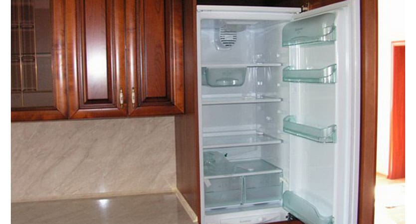 - Isolation phonique relative. Contrairement aux réfrigérateurs autonomes, les réfrigérateurs encastrés produisent beaucoup moins de bruit ou seront silencieux du tout. Cela est dû au fait qu'il est cousu dans un placard dont le cadre retient le son de son travail.