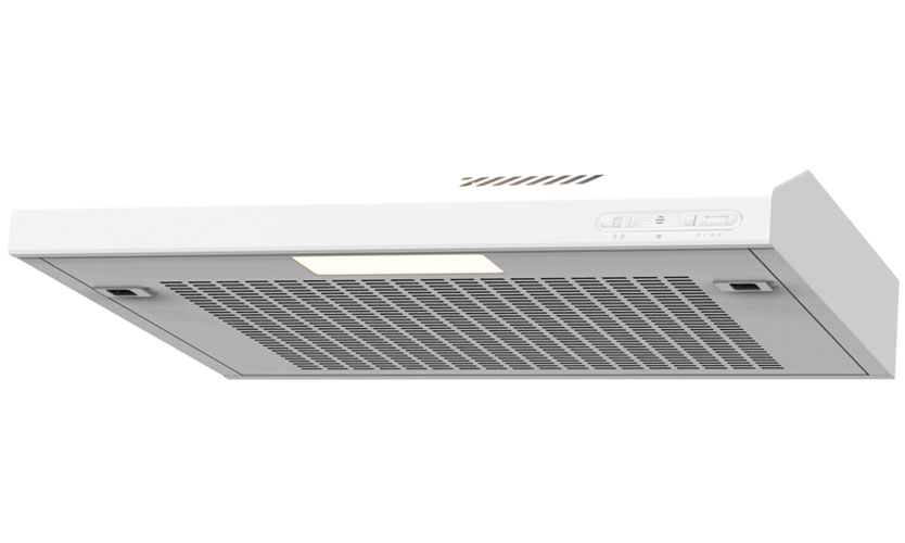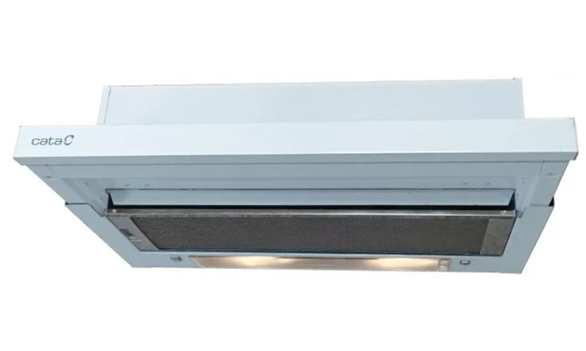 Conception en armoire avec mécanisme de retrait. La dimension d'installation est de 60 cm de large et la sortie d'odeur est de 120 mm. Le corps est blanc, en métal. Puissance 90 W, un moteur installé.