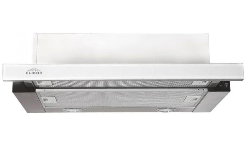 Modèle entièrement encastré (27,5x60x28,5 cm) avec passepoil noir. Le passage à l'une des trois positions est effectué par des capteurs. Productivité 650 cc m / h. S'allume avec deux lampes à diode de 1,9 W. Équipé d'une minuterie pour la mise hors tension automatique. Indique que le filtre est sale. Prévoit l'installation d'un clapet anti-retour. Bruit de puissance 51 dB. Prix: 8270 roubles.