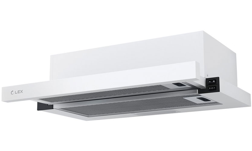 Hotte blanche de 28 cm de profondeur.Les deux vitesses de rétraction sont commutées avec des boutons. La productivité est de 570 mètres cubes / h. L'éclairage est assuré par une lampe LED de 2,5 W. Puissance 103 W (moteur 100 W). Bruit 48 dB. Poids 6 kg. Prix: 4060 roubles.