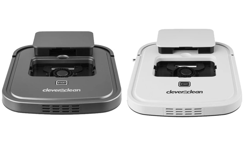 Le robot Clever & Clean a la forme d'un rectangle plat avec des bords arrondis, mesurant 25,6x22,8 cm, une faible hauteur, seulement 3,2 cm et un poids de 0,825 kg. Le corps est en plastique. La face avant est dans une combinaison de gris foncé et de blanc, et le dos est noir.
