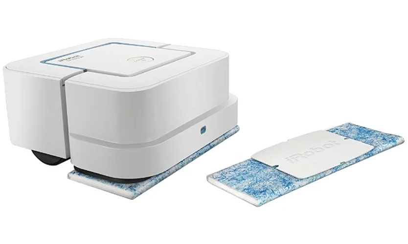 Pendant le lavage, un chiffon en microfibre bleu est installé. Le processus suit cet algorithme: l'appareil asperge de l'eau sur le sol, puis l'essuie. Ce mode peut être utilisé pour les sols lisses - linoléum, carrelage, stratifié. Le travail peut prendre jusqu'à une heure. L'efficacité du lavage est d'environ 95%, une charge de batterie suffit pour 30 m2 de surface. Le robot passe plusieurs fois par un même endroit, c'est pourquoi une efficacité de travail aussi élevée est obtenue.