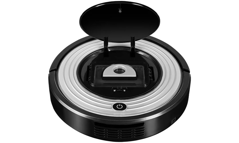L'aspirateur a une forme ronde familière avec un diamètre de 30 cm et une hauteur de 8 cm et pèse 3 kg. Le corps de l'appareil est en plastique dans une combinaison de couleurs noires et grises, agréable à l'œil avec un design attrayant. Le panneau supérieur est presque entièrement occupé par le couvercle du bac à poussière. Sur le bord, il y a un bouton d'alimentation avec un indicateur lumineux.