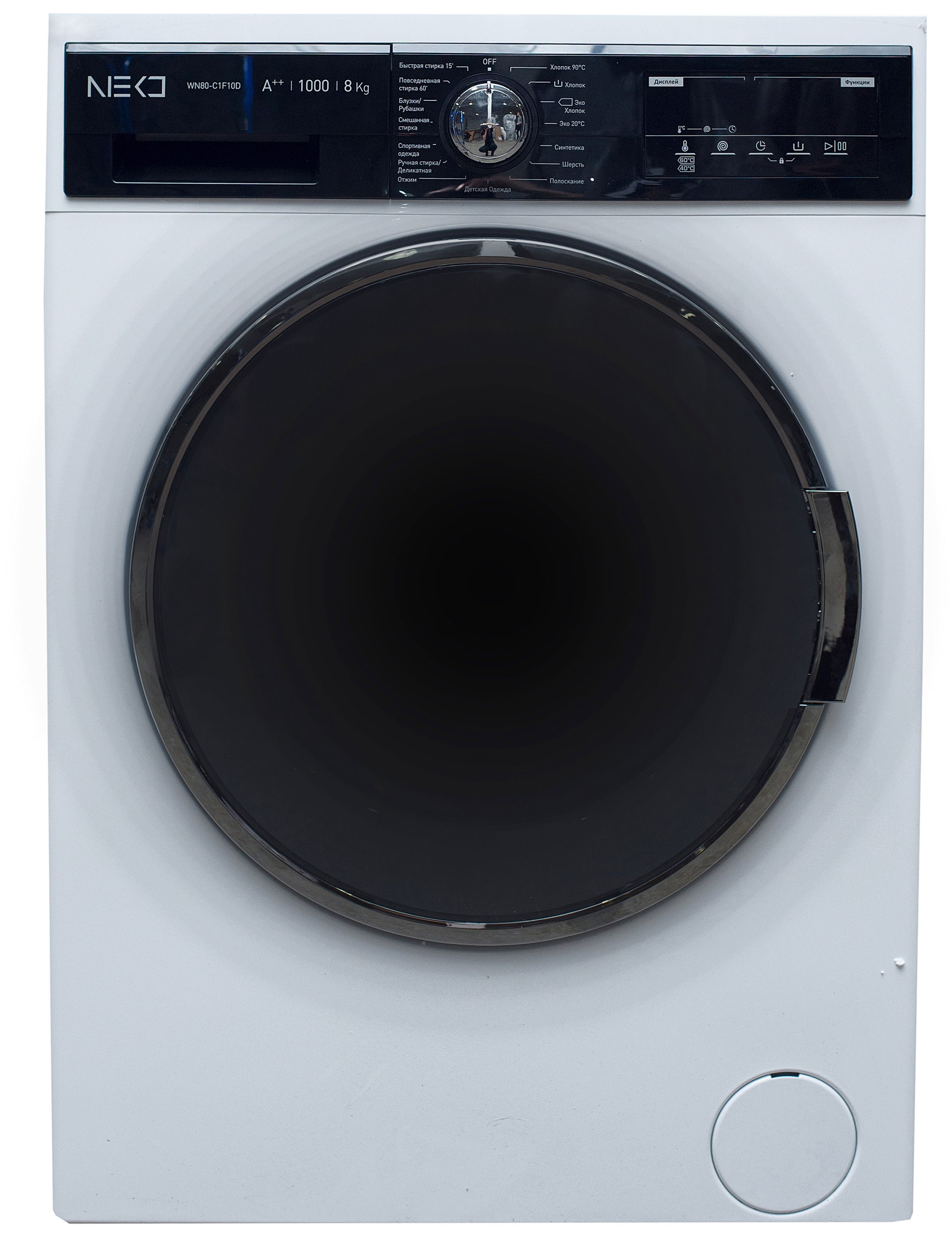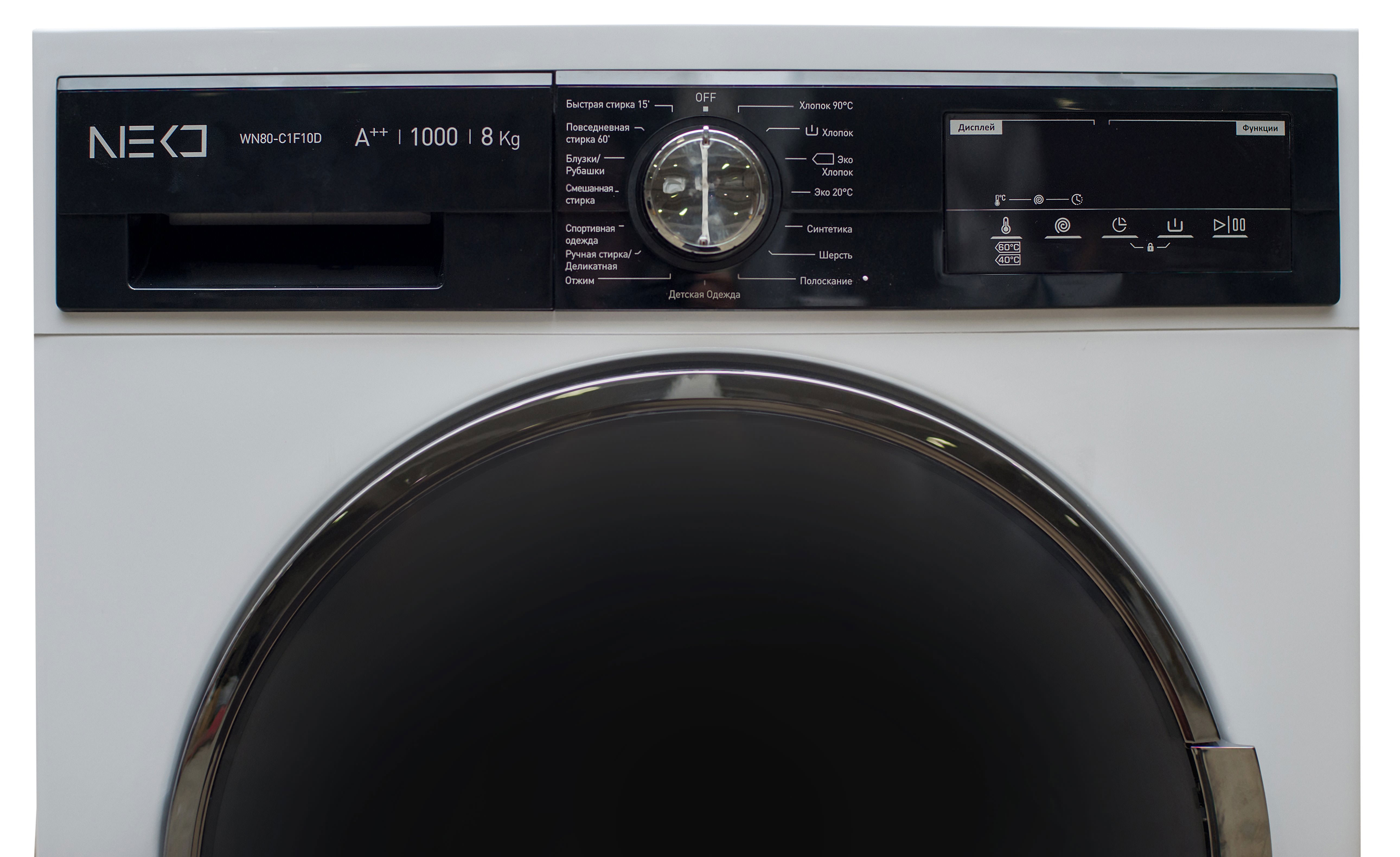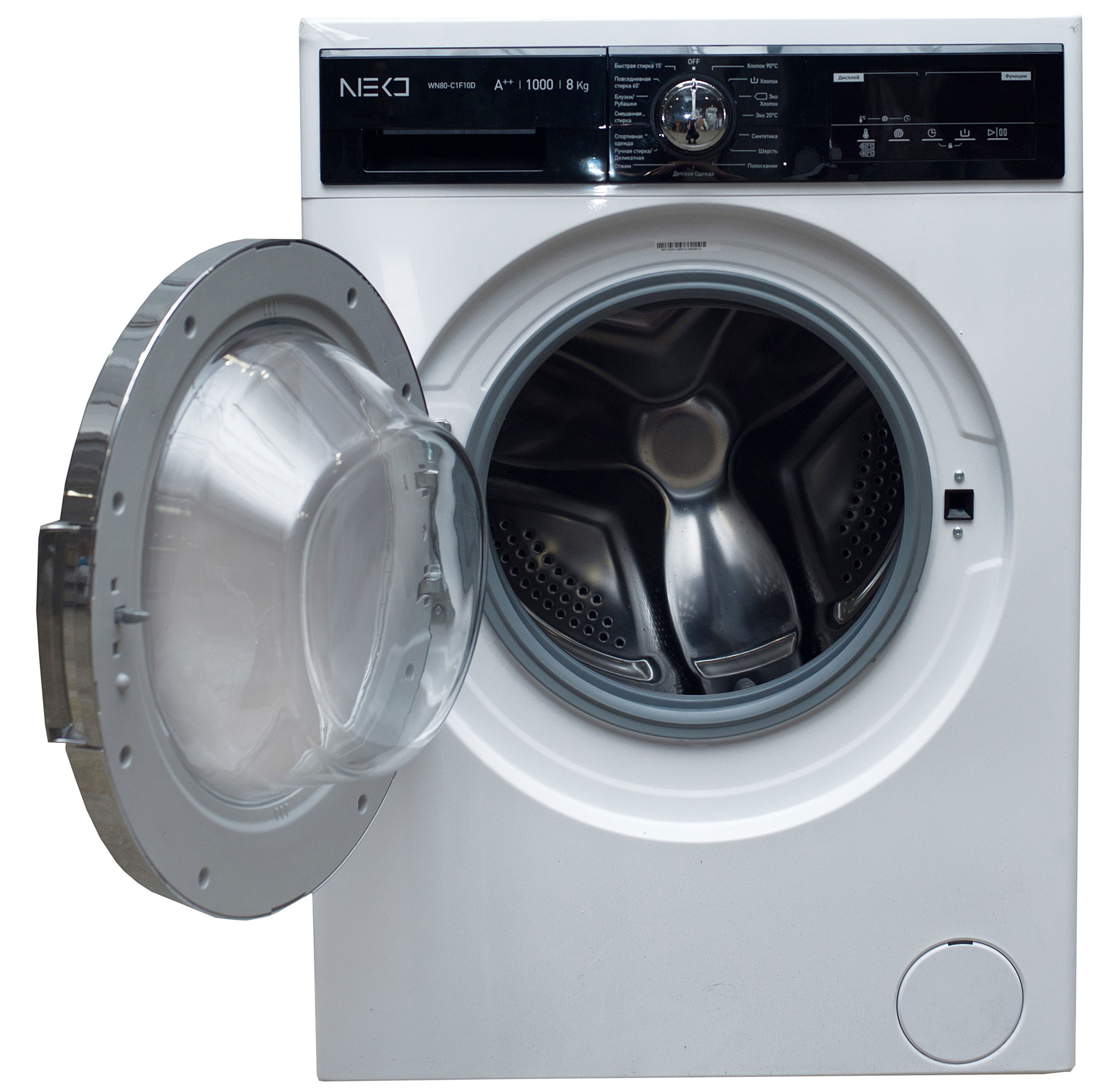 NEKO WN80-C1F10D est fabriqué dans une couleur blanche classique. Le panneau de commande avec affichage LED dans la partie supérieure est surligné en noir -semble très riche... Dimensions - 84,5 × 59,7 × 55,7 cm, poids - 72 kg. Figurines idéales pour une machine avec une charge de 8 kg.