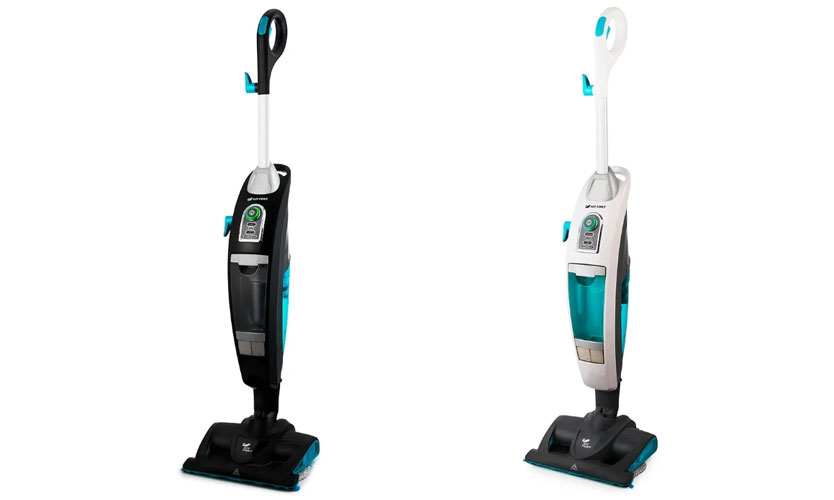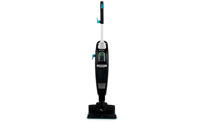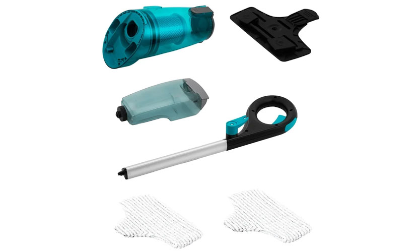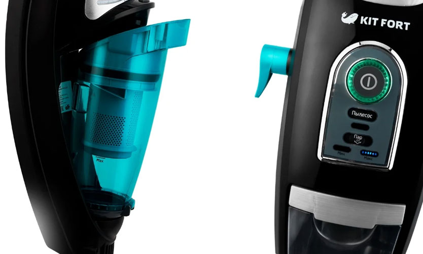 Aspirateur au design moderne, de couleur argent avec inserts turquoise: poubelle, boutons, fond de brosse. Vous pouvez utiliser l'aspirateur avec ou sans la poignée d'extension fixée. Une fois installé, la hauteur de l'aspirateur passe de 84 à 120 cm, ce qui est plus ergonomique compte tenu de la taille de la personne. De plus, c'est dessus que se trouve le bouton d'alimentation en vapeur.