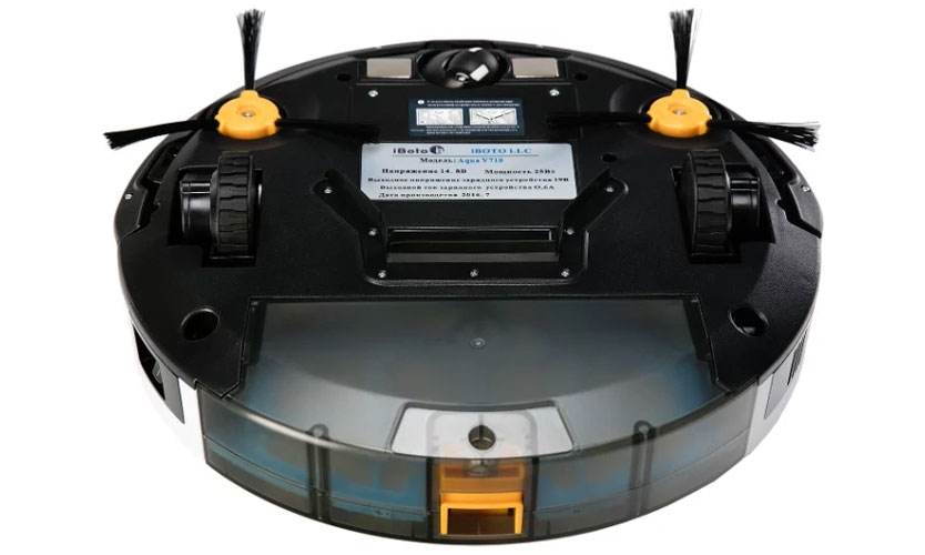 Sur le côté droit, il y a des connecteurs d'alimentation pour le chargement, un bouton pour déconnecter la batterie de l'aspirateur.En bas, il y a des patins de contact, une roue avant pour manœuvrer, un couvercle du compartiment de la batterie, deux brosses latérales, un trou pour aspirer les débris, des grattoirs en caoutchouc le long de sa jante. Le mouvement est effectué par une paire de roues motrices. Sur le devant, près du bord du bas, il y a trois capteurs IR qui détectent les différences d'élévation.