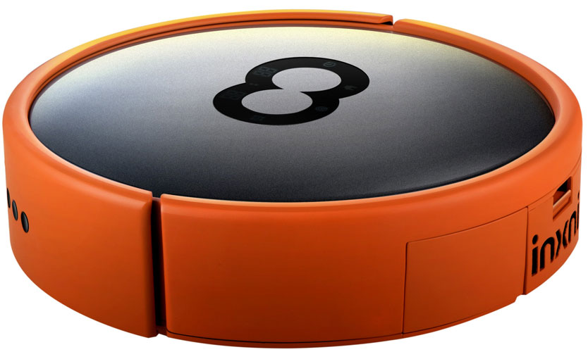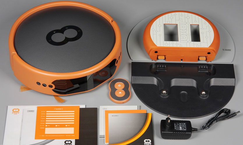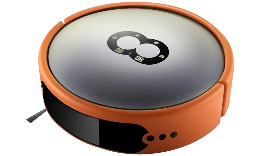 Le corps est mat, de couleur orange foncé, tout en conduisant, il peut être clairement vu dans la pièce. Sur le dessus, il y a du plastique transparent teinté, au centre se trouve un système de contrôle composé de boutons tactiles regroupés en huit. Ce système de contrôle vous permet de démarrer le travail ou d'arrêter le mouvement. Il existe également des indicateurs indiquant la charge de la batterie, les erreurs et l'heure actuelle. Ils sont tous surlignés en orange vif.