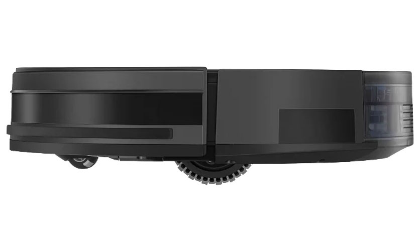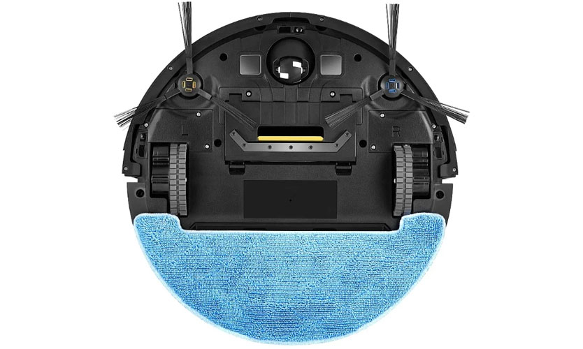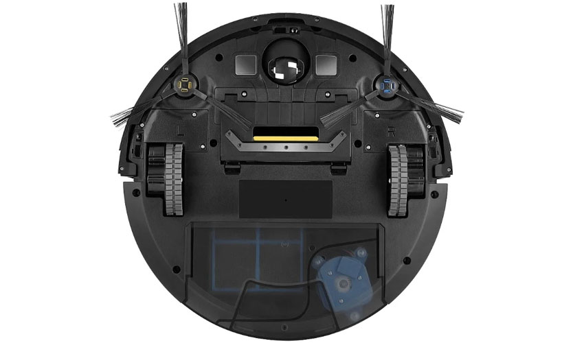 Le fond est en plastique noir. Il a une paire de roues en caoutchouc avec crampons, un tampon de contact, des capteurs de détection de vide, un orifice d'aspiration, une paire de brosses latérales, un couvercle de batterie, une zone de montage de serviette. ILife V8s tourne facilement grâce au même rayon de l'essieu moteur avec le diamètre du corps.