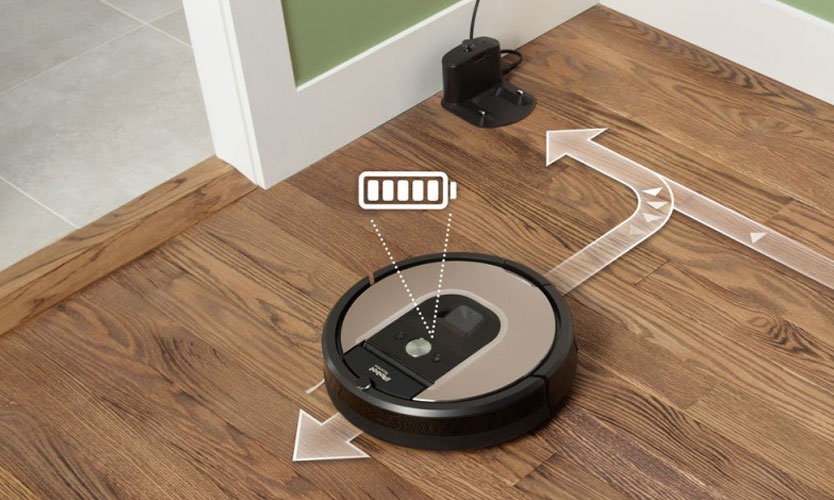 L'appareil est automatiquement envoyé à la base. Si le travail n'est pas terminé, l'iRobot Roomba 966, après la recharge, démarre à partir du point où il a été interrompu.