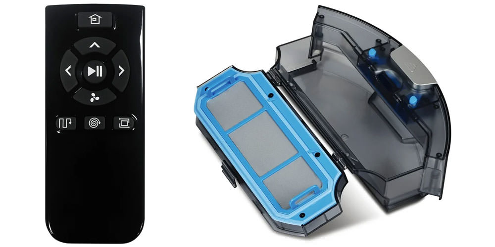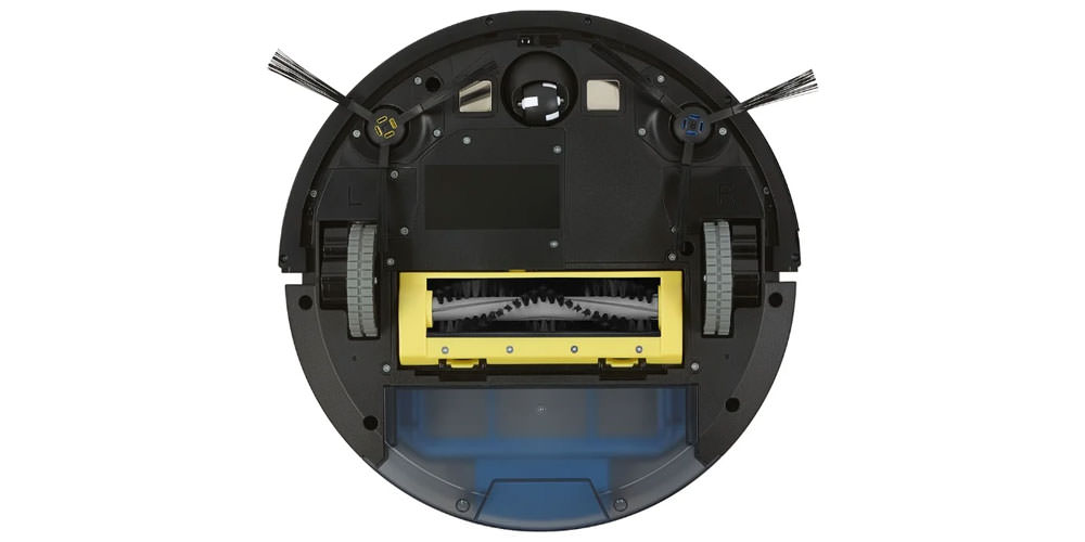 En haut, il y a des boutons de commande et un écran LCD. Sur le côté, il y a un pare-chocs à ressort avec une doublure de protection en caoutchouc, une prise pour connecter un adaptateur secteur, un bouton marche / arrêt pour l'appareil. Ci-dessous - deux roues motrices sur les côtés, un rouleau pivotant avant, un emplacement pour le rechargement automatique de l'aspirateur à la station d'accueil, deux brosses latérales, une brosse turbo centrale, un couvercle de batterie, des capteurs de différence de hauteur, une zone pour fixer un chiffon en microfibre. Il y a trois capteurs de différence de hauteur le long des bords de l'appareil: grâce à eux, le robot aspirateur peut éviter de tomber des marches.