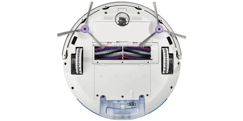 La maniabilité de l'appareil est due à la présence de roues motrices sur les côtés et d'un galet pivotant en bas. À proximité - un compartiment pour la batterie, des capteurs de différence de hauteur. Des brosses sèches, des buses à eau, un panneau en microfibre (nettoyage humide) sont montés sur le fond du nettoyeur électronique Weissgauff.